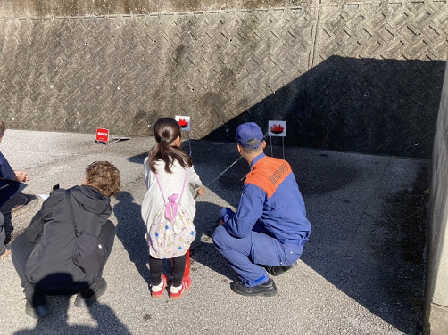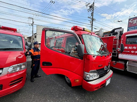 その後、消防署員さんがキャビテーション(給水する際の給水ホースに空気を入れないようにする方法)を実演して下さり、座学のみでなく実際に見て聞いて学ぶことができました。