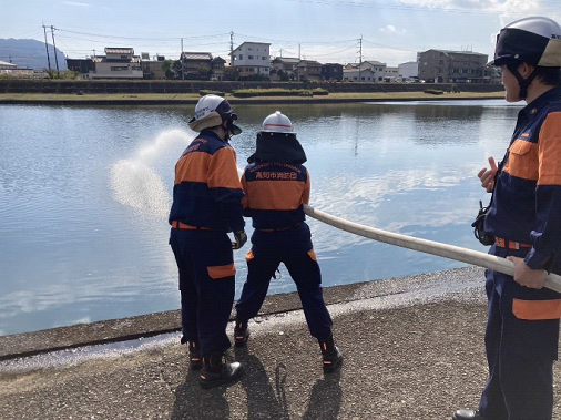 令和6年6月23日(日)鏡川 廓中堰にて第一大隊の7分団が、長距離(中継)放水訓練を消防署員さん指導の下行いました。