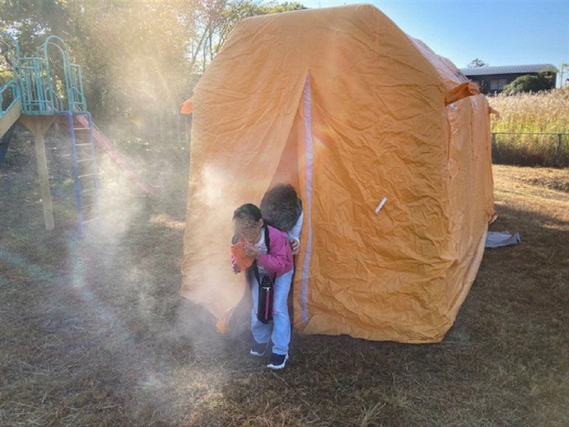 今回の防災訓練では、他にも中央消防署による煙体験ハウスと消火栓使用方法、トラック協会による起震車体験、町内会による防災倉庫の点検や警察の方による過去の震災パネル展示など、各ブースを順番に回りながら、多くの方がいろんな体験をすることができたと思います。