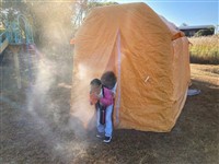 種目にバケツリレー、初期消火、毛布で簡易担架を作り搬送、障害物競走に煙体験を組み込むなど、また、昼食時には炊き出し訓練のおにぎりと豚汁を出し、食事が終わる頃には運動場で心肺蘇生法を展示し、引き続きテント内で指導などを行いました。