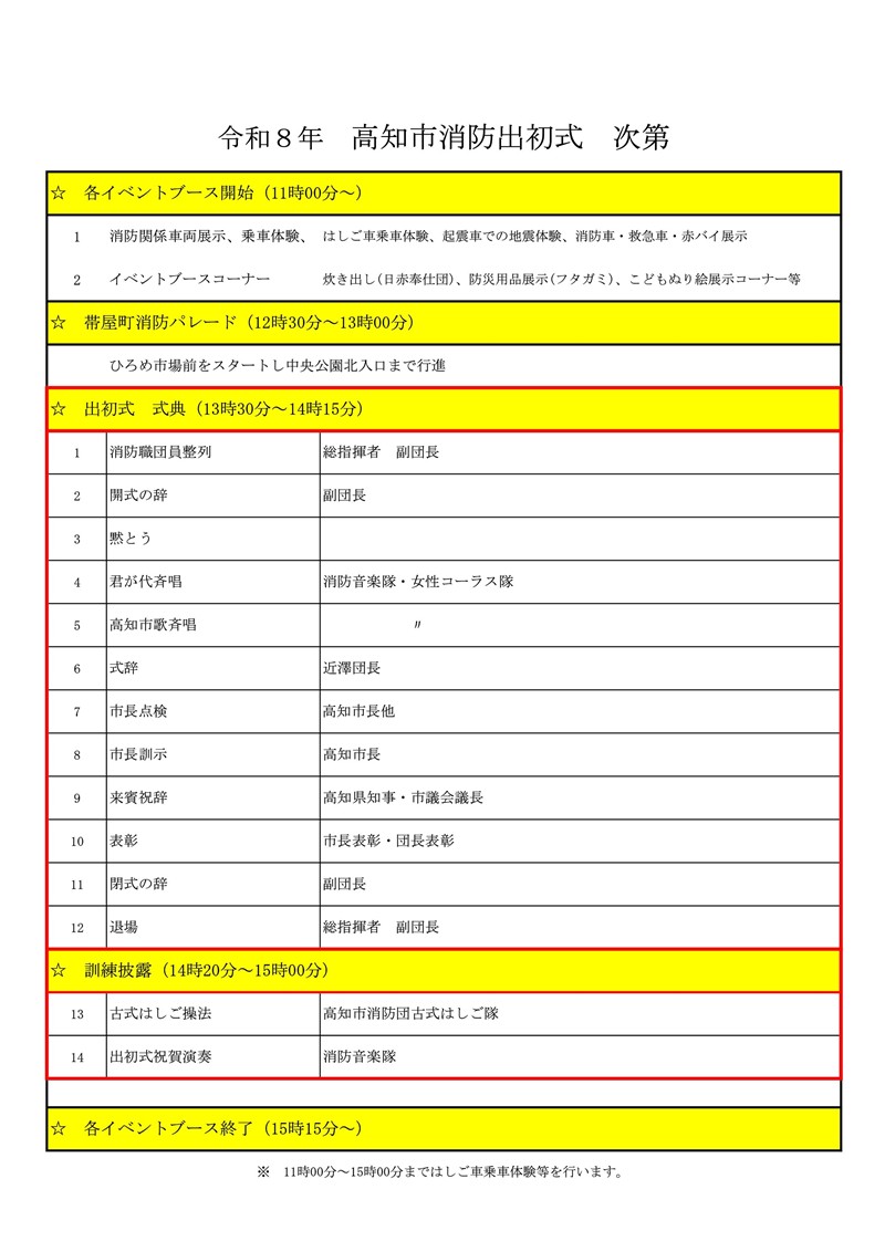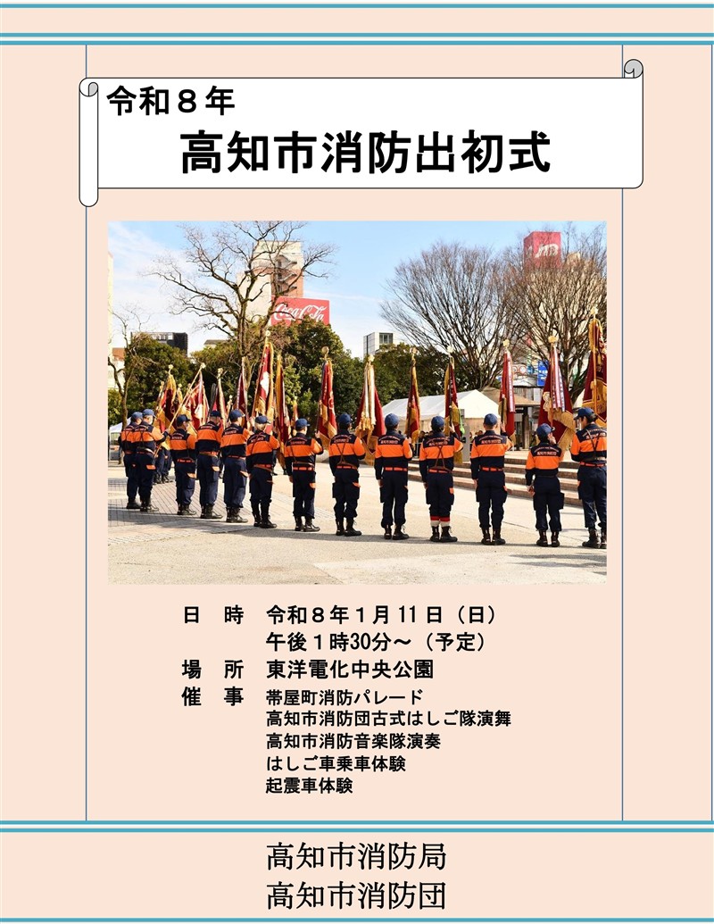 新春恒例の令和8年高知市消防出初式を令和8年1月11日(日曜日),東洋電化中央公園にて開催します。(雨天時は中止です)